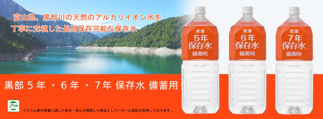 富山県、黒部川の天然のアルカリイオン水を丁寧に充填した長期保存可能な保存水